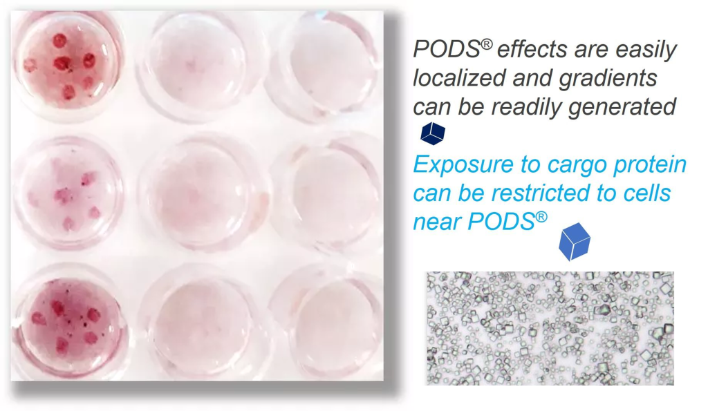 PODSは非常に安定性が高く、培養容器表面に付着させたり、ゲルなどの生体材料に埋め込んだりできるため、PODS結晶を特定の位置に付着させると、拡散とタンパク質分解による放出により濃度勾配を作成できます。